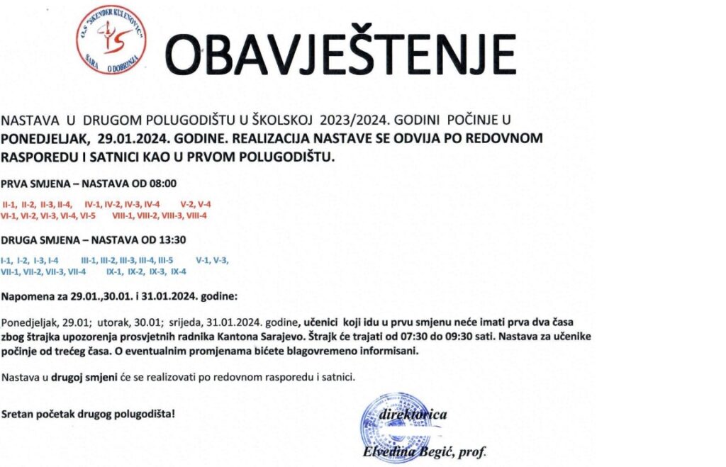 OBAVJEŠTENJE O POČETKU NASTAVE U DRUGOM POLUGODIŠTU