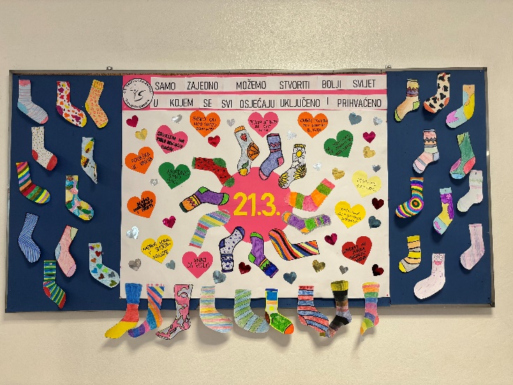 Down sindrom je specifičan po jednom hromosmu više na 21. paru, a to je i ono što je posebno da oni za jedan stepen više osjećaju, više vole i suosjećaju se sa drugima. Simbol obilježavanja Svjetskog dana osoba sa Down sindromom jesu šarene čarape, pa su i ove godine naši učenici III razreda zajedno sa svojim učiteljicama i asistenticama u znak podrške nosili šarene čarape i formirali krugove povjerenja i ljubavi. Učenici VII, VIII i IX razreda su sa nastavnicom Hajrom Kadrić na časovima tehničke kulture napravili pano posvećen osobama sa Down sindromom. Ovom prilikom želimo poručiti da smo svi različiti, ali podjednako važni!