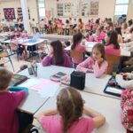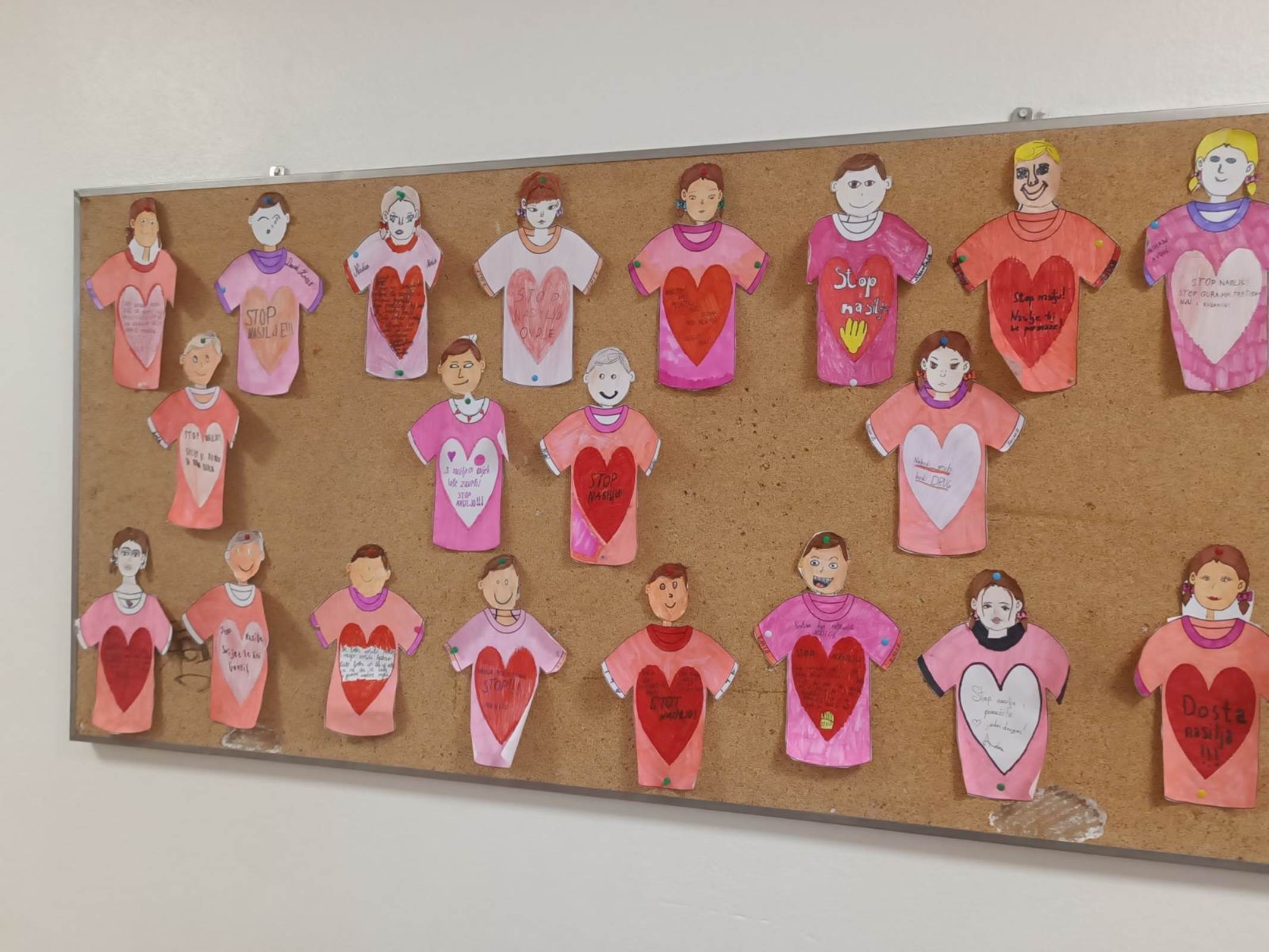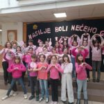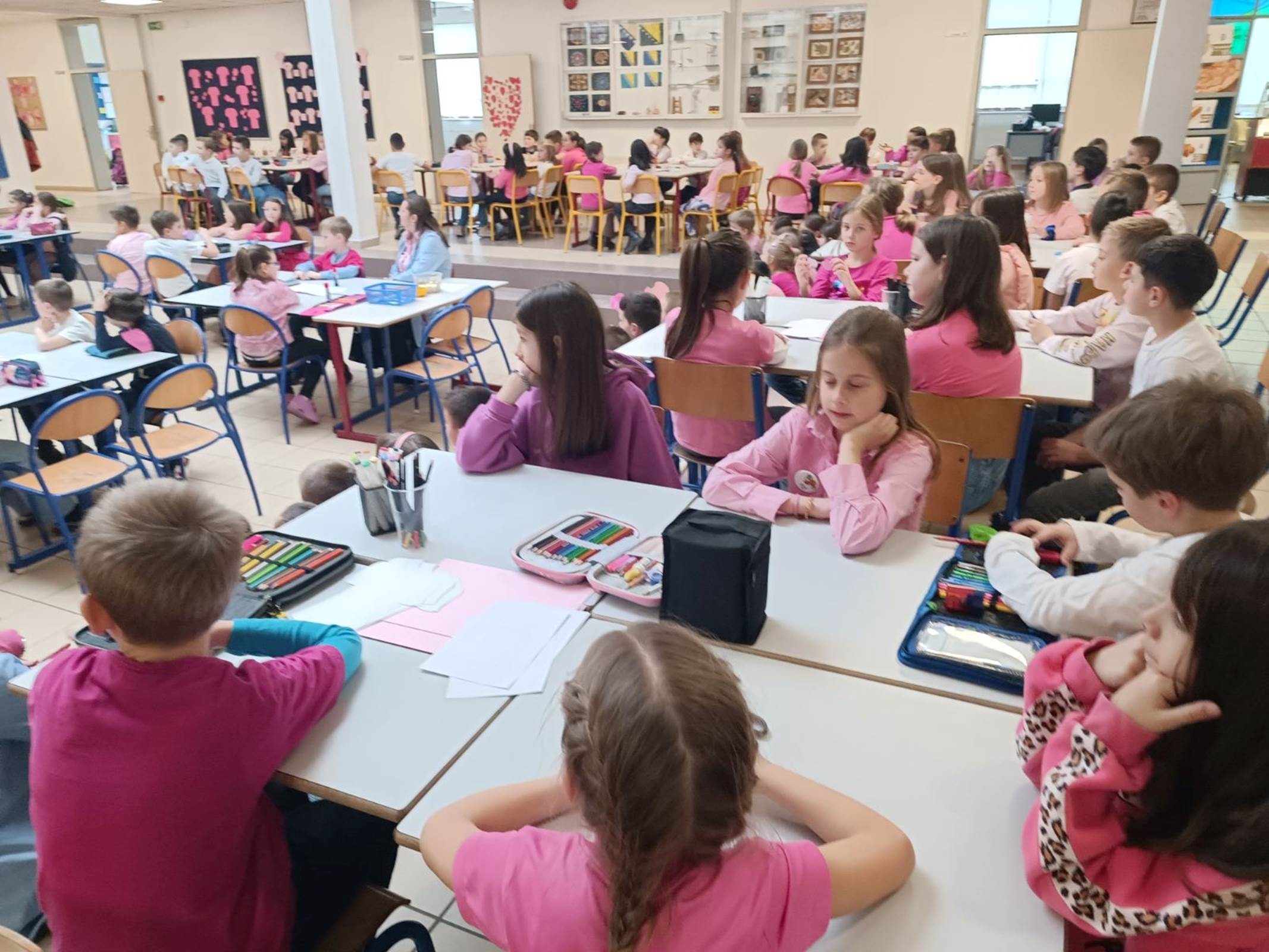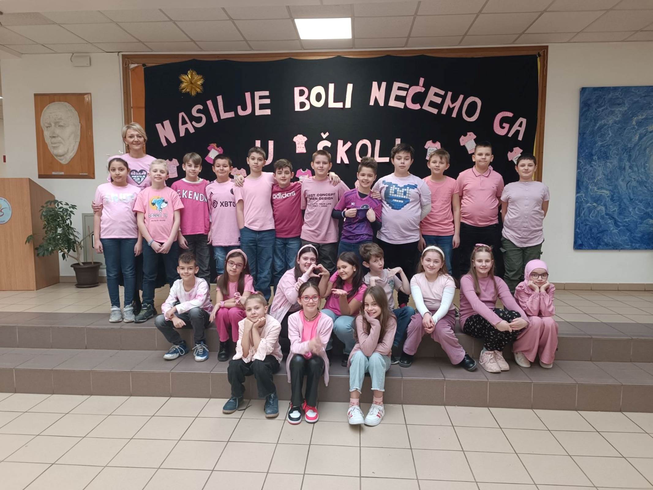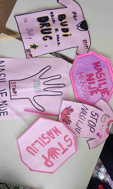 Obilježavanje Dana ružičastih majica nastavljeno je i u poslijepodnevnim satima realizacijom neobično kreativnog uglednog časa iz predmeta Likovna kultura sa svim učenicima trećih razreda. Učenici su likovnim izražajem i plesom također poručili: „Trend je biti friend“, „Neka nam srce kuca u ritmu prijateljstva“, „Ne rugaj se, jer boli me!“… i svojom izložbom dodatno ukrasili hol škole.