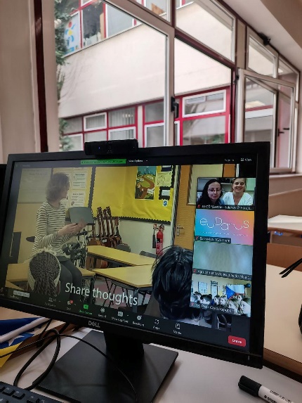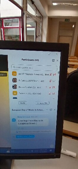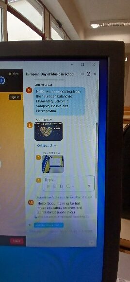 Dana 14. marta u 11.00 sati pristupili smo virtuelnom događaju obilježavanja Evropskog dana muzike u školama, putem Zoom platforme. U obilježavanju Evropskog dana muzike učestvovali su nastavnica muzičke kulture Katarina Puketa, učiteljica Enisa Terović i nastavnik informatike Adnan Šehić.