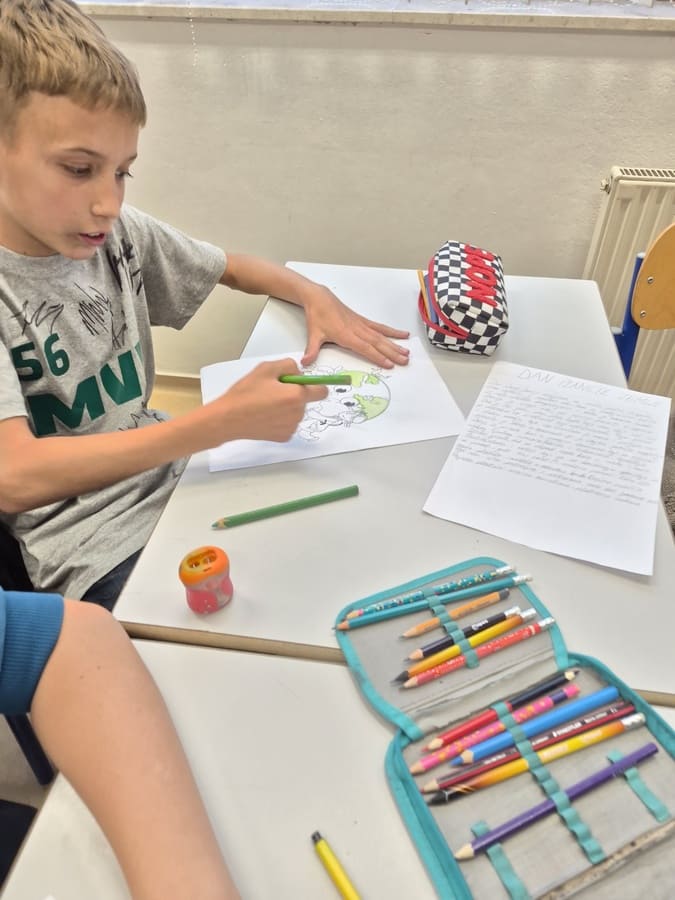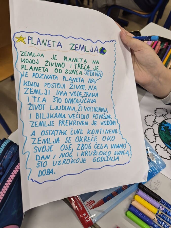 Danas je u odjeljenju V-2 realizovana radionica povodom obilježavanja Dana planete Zemlje, ispunjena posebnom toplinom, kreativnošću i iskrenim dječijim emocijama. Učenici su s velikim entuzijazmom pisali poruke posvećene ovom važnom datumu, kroz koje su na svoj način izrazili ljubav prema prirodi i brigu za našu planetu. Njihove riječi bile su jednostavne, ali snažne i pune nade.