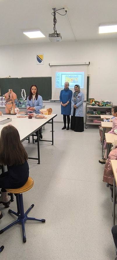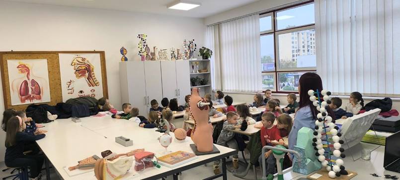 14.11.2024. godine našu školu je posjetila predškolska grupa vrtića “Vjeverice” sa svojim učiteljicama. U dijelu realizacije projekta u kojem su trebali upoznati tijelo, posjetili su našu školu i u kabinetu biologije imali priliku da kroz različite modele upoznaju tijelo. Naša nastavnica biologije, Suada Muslić, održala je zanimljivo predavanje za malu raju.