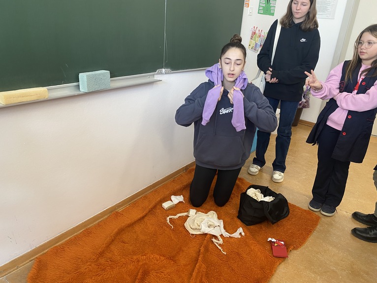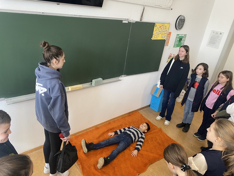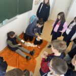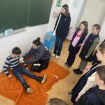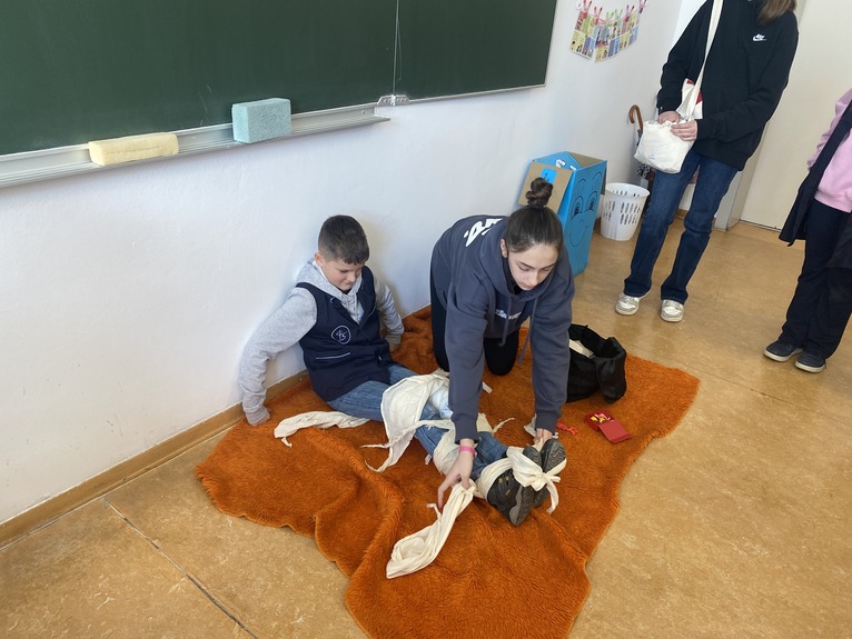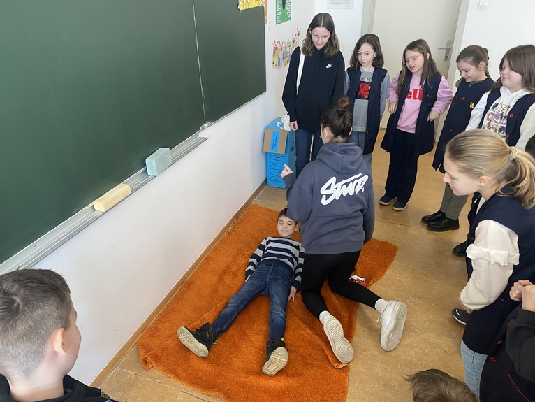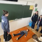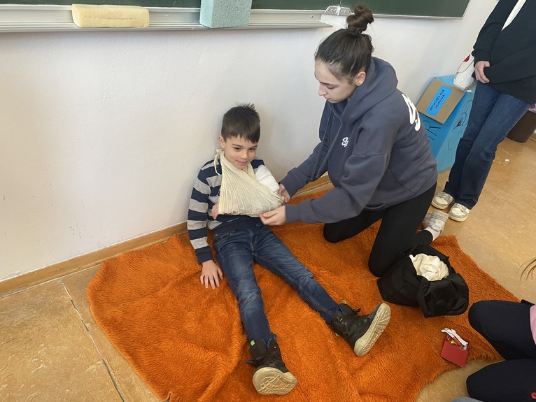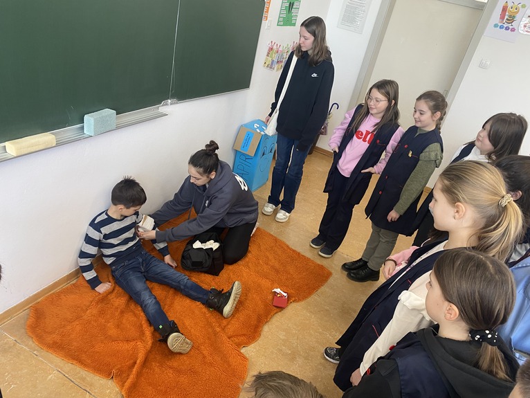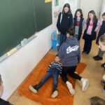 Zatim su učenice 8. razreda sekcije iz Prve pomoći koju vodi nastavnica Indira Dokara. učenicima demonstrirale kako se treba ponašati tokom pružanja prve pomoći unesrećenom.