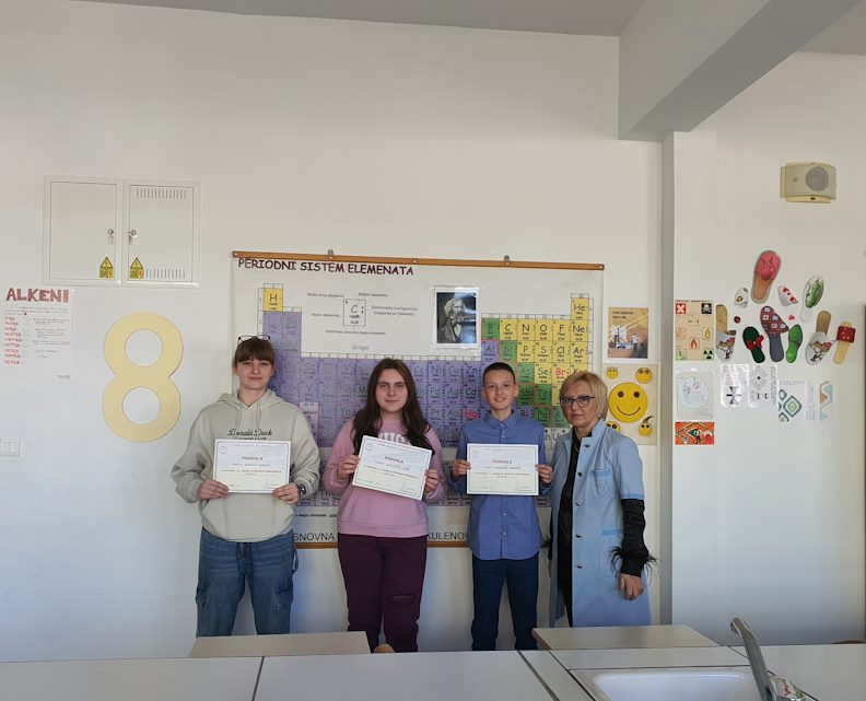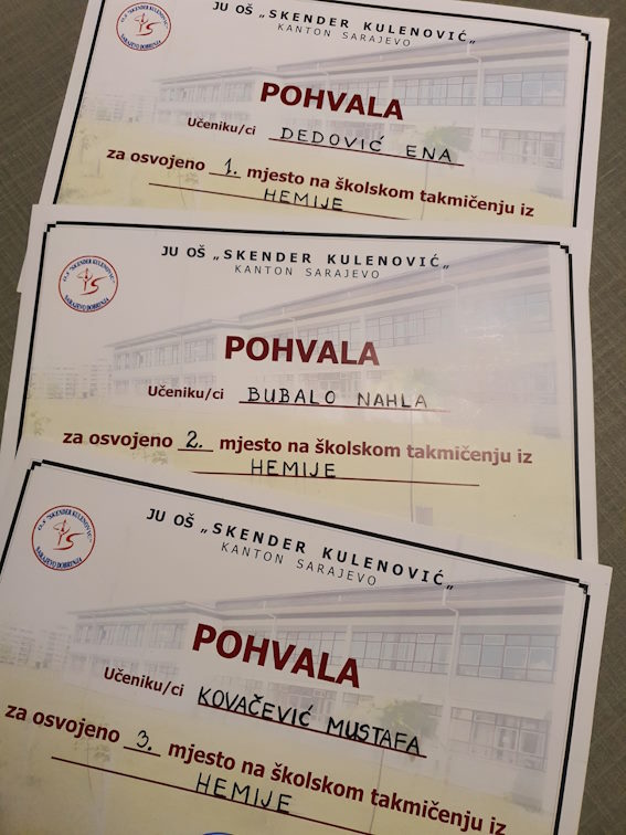 Prvo mjesto osvojila je Ena Dedović, koja će predstavljati našu školu na Kantonalnom takmičenju iz Hemije u maju.
